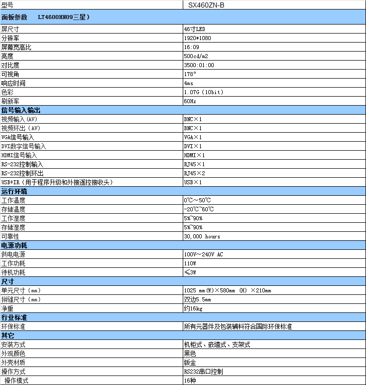 46寸3.5mm液晶拼接屏技術(shù)參數(shù):
